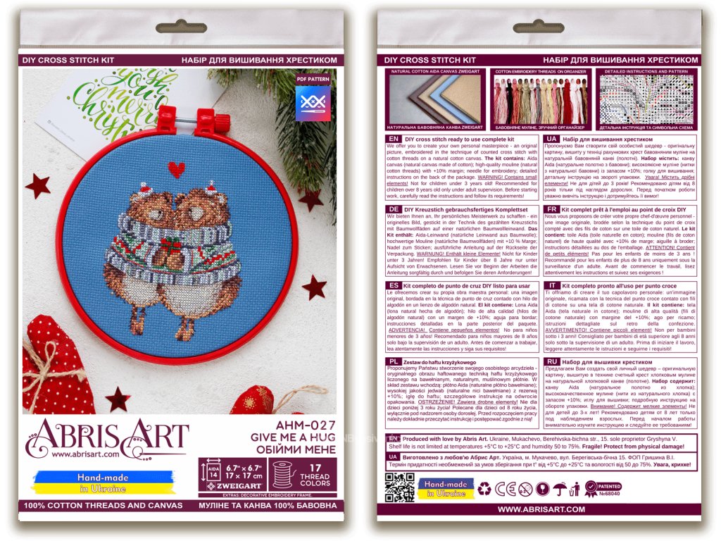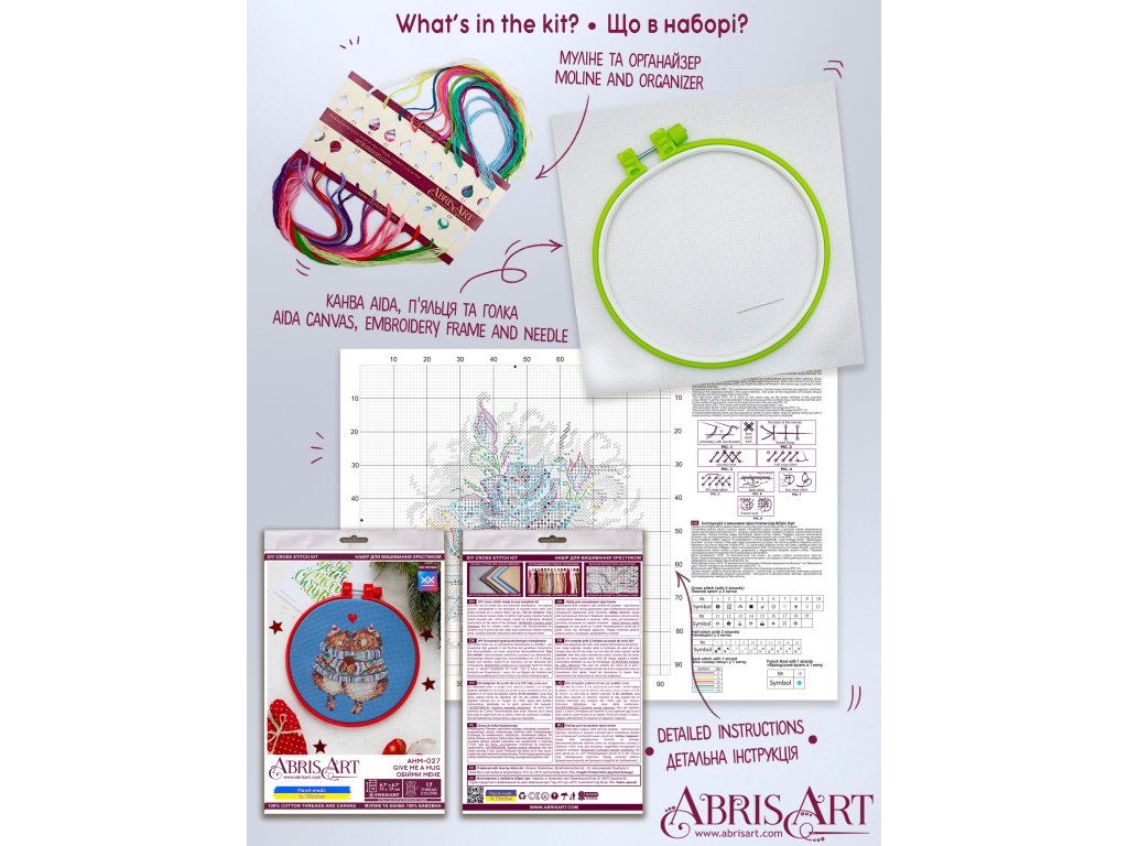 Balení obsahuje: bavlněné příze (17 barev)Aida 14ct modrá papírová předlohaplastový rámečeknávod jehla