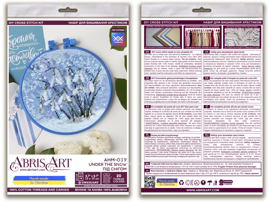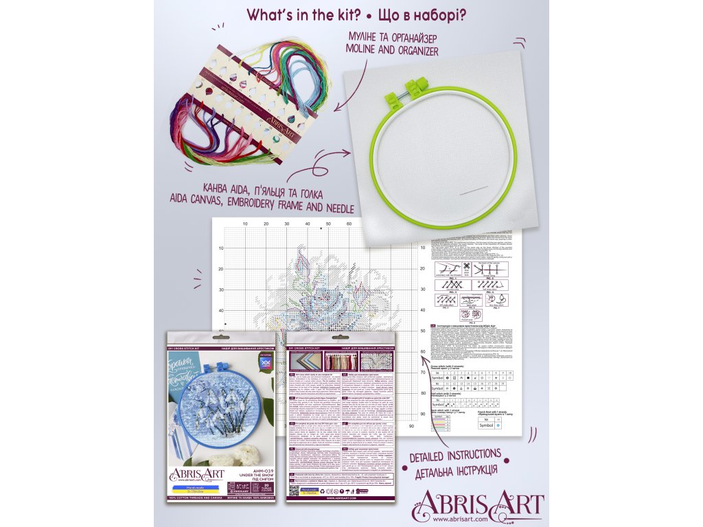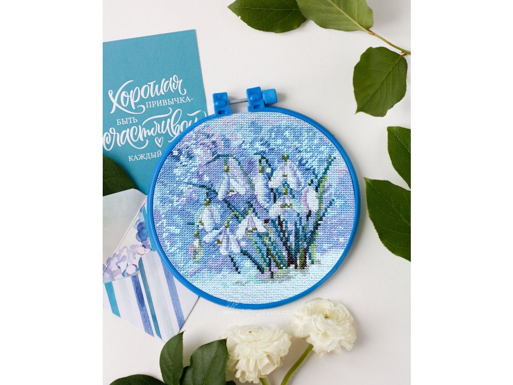 Balení obsahuje: bavlněné příze (20 barev) Aida 14ct světle modrá papírová předlohaplastový rámečeknávod jehla