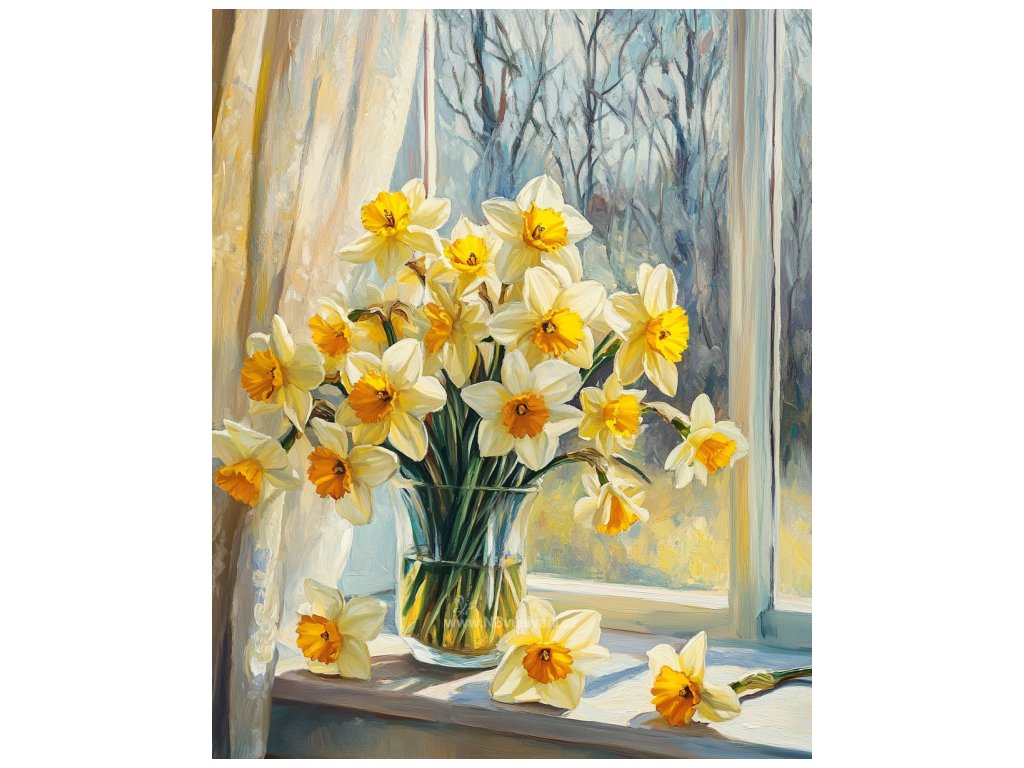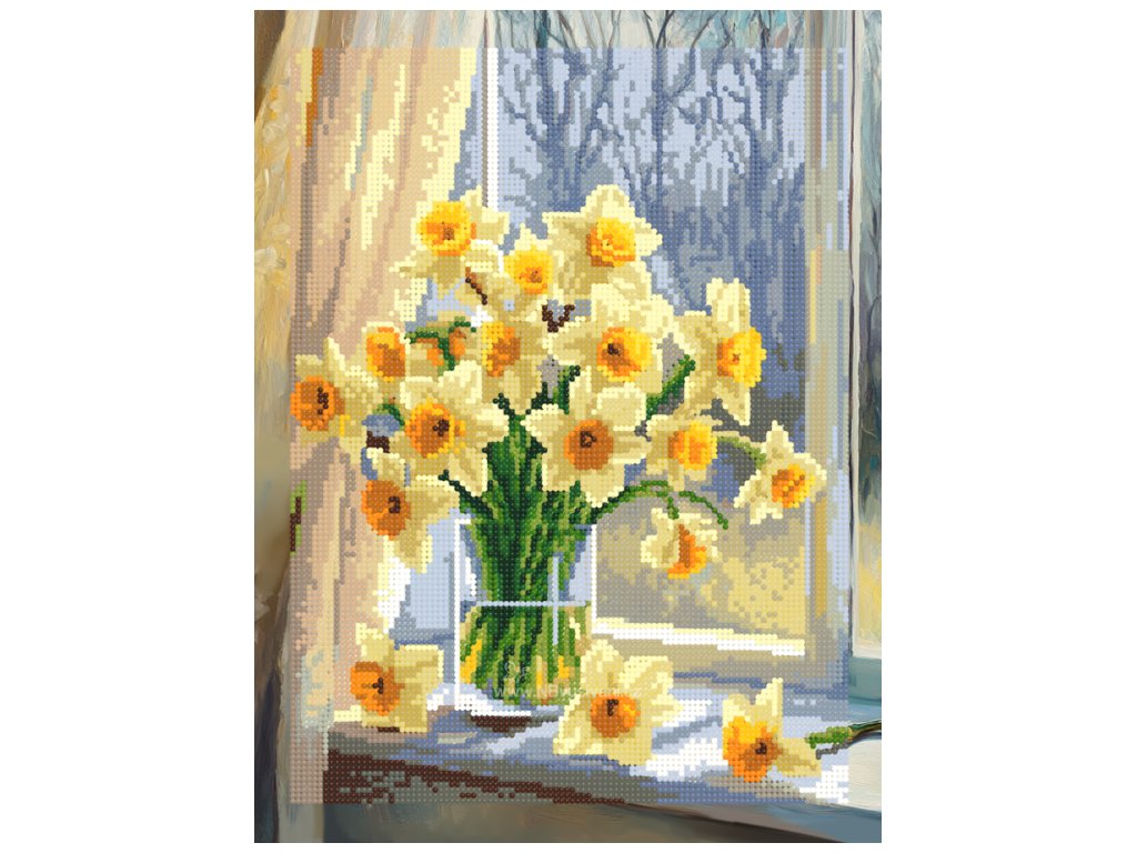 plátno s předtištěným motivem pokryté lepící vrstvou nataženou na dřevěném rámu