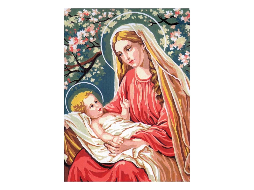 Barevně předtištěný motiv na látce hnědý Stramín s barevným klíčem pro vyšívací příze.