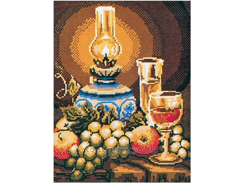 Barevně předtištěný motiv na látce hnědý Stramín s barevným klíčem pro vyšívací příze.
