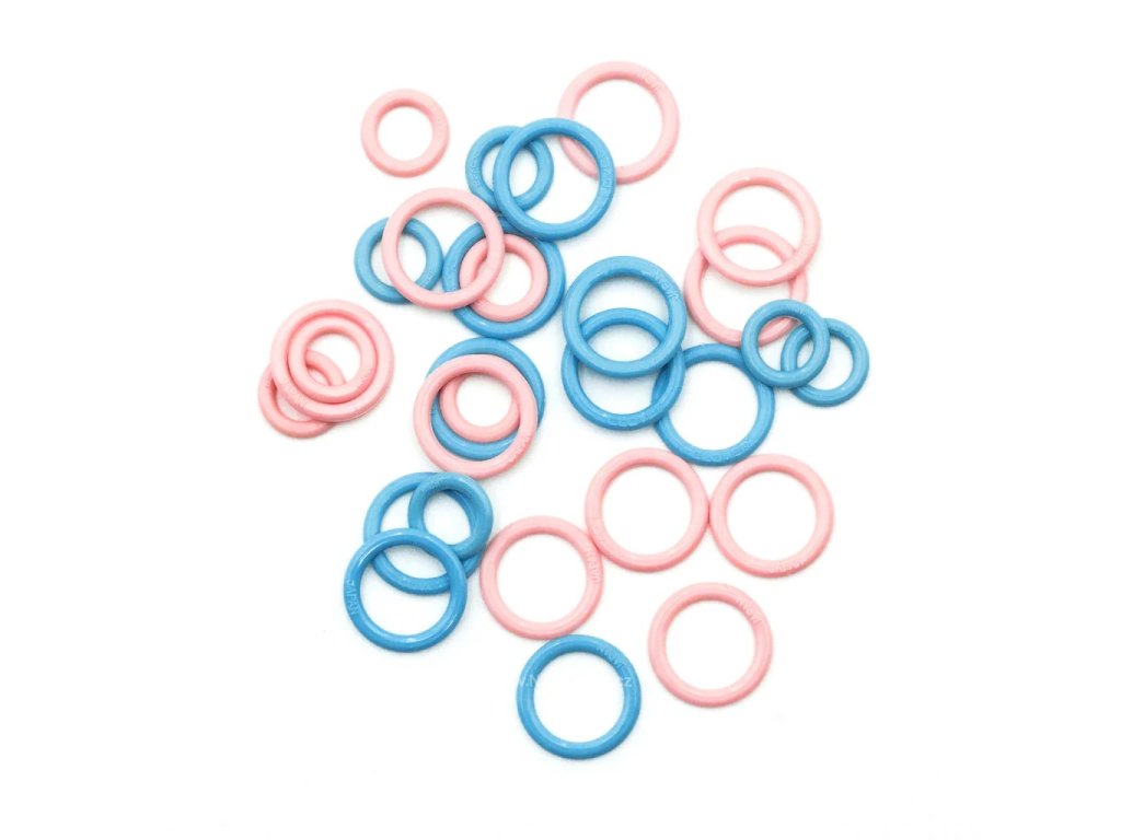 Sada plastových kroužkových značkovačů ok (stitch ring markers), které se nasazují přímo na jehlice a slouží k přesnému označení začátku nebo konce vzoru, míst pro zvyšování či snižování počtu ok nebo k přehledu o opakujících se motivech.