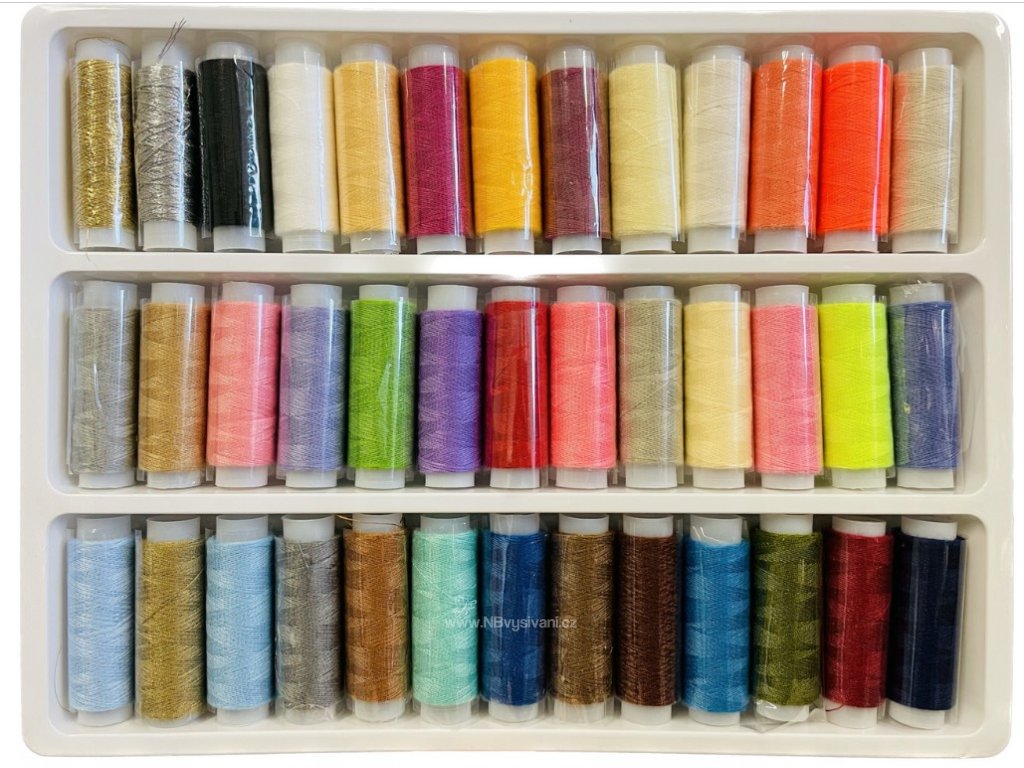 Sada bavlněných nití a dvou metalických v plastovém kufříku firmy Aliga. Návin 100 m a 39 ks v balení.