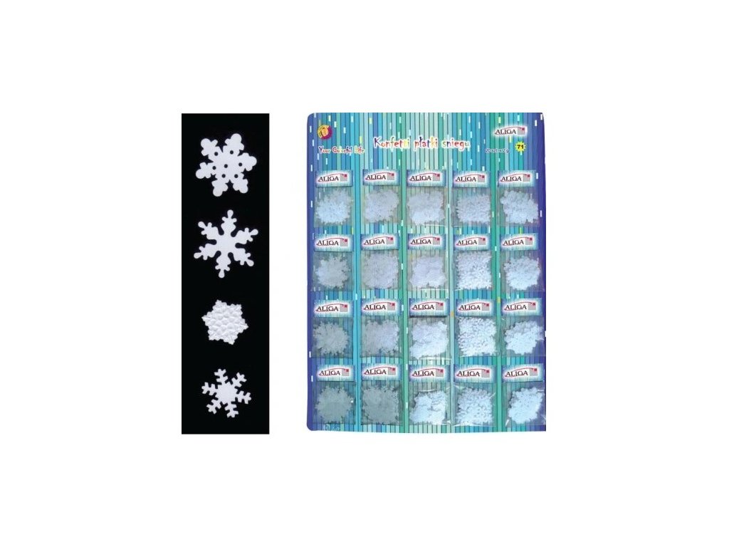 Konfety - sněhové vločky pro další tvoření firmy Aliga. Balení 5 druhů po 4 sáčcích, celkem 20 balíčků. Viz foto.
