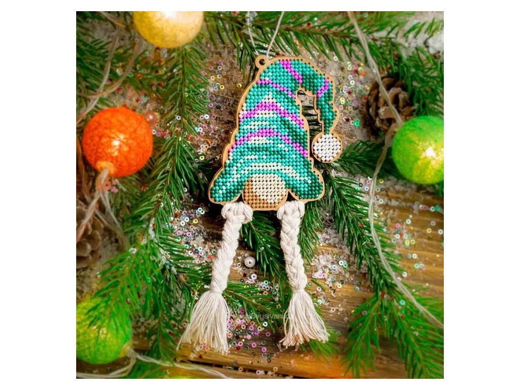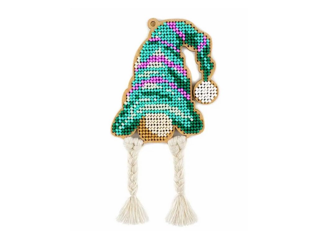 WON-FLK496 Vánoční ozdoba - skřítek v zelené čepici (vyšívaná korálková překližka)