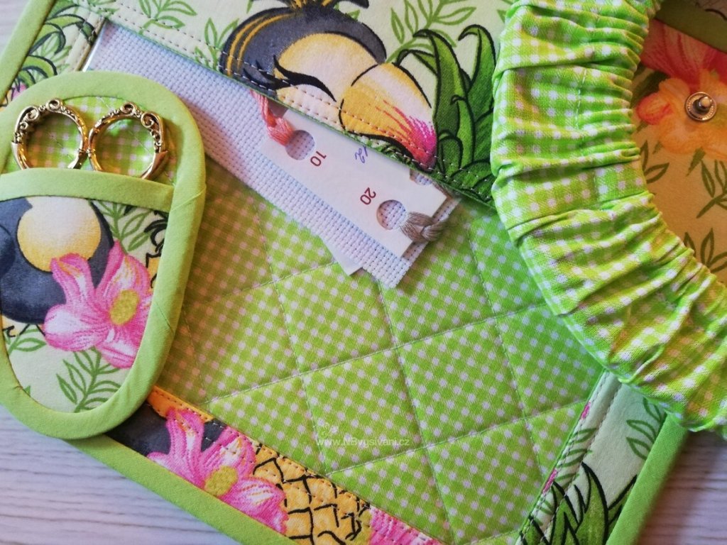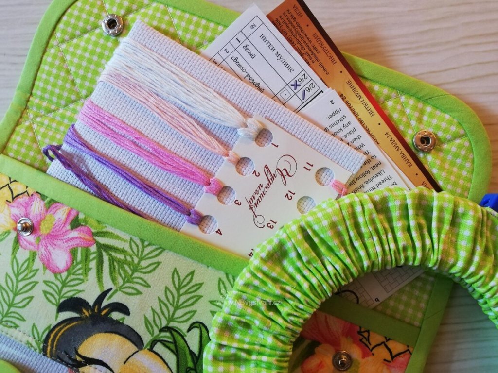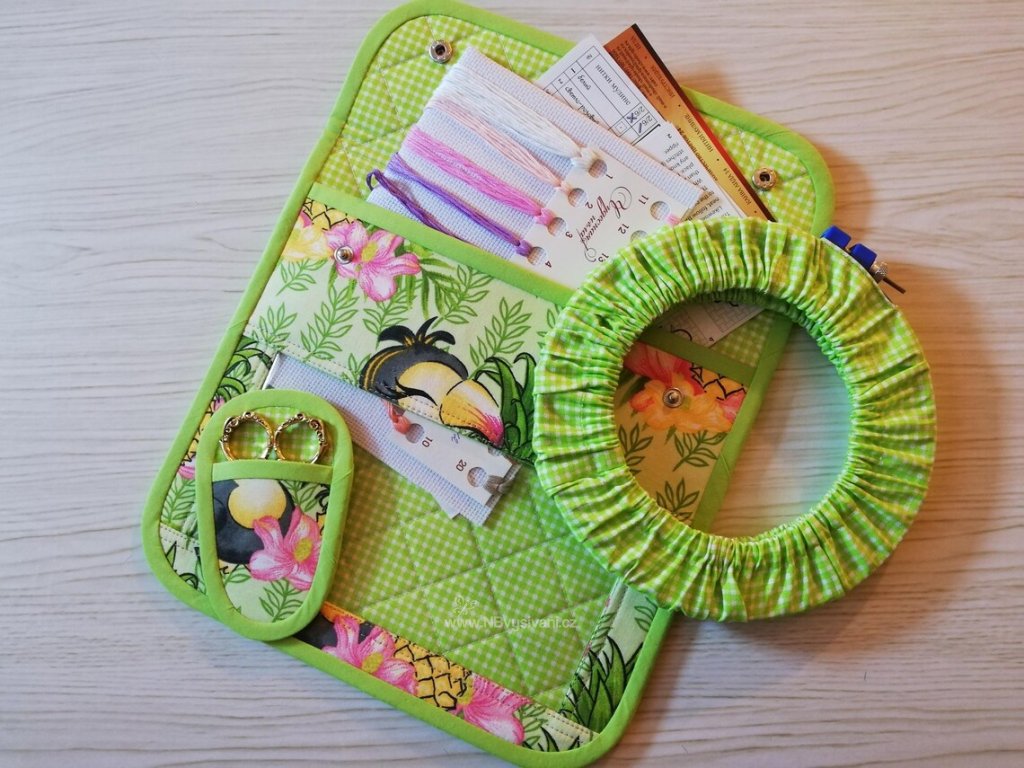 Praktický, ručně šitý cestovní set s ochranným pouzdrem na nůžky a obalem na vyšívací kruh o velikosti 16-20cm. Vhodné na menší projekty, třeba k vodě a pod.