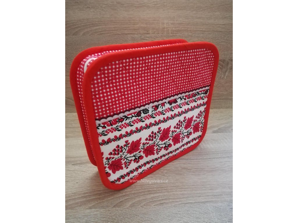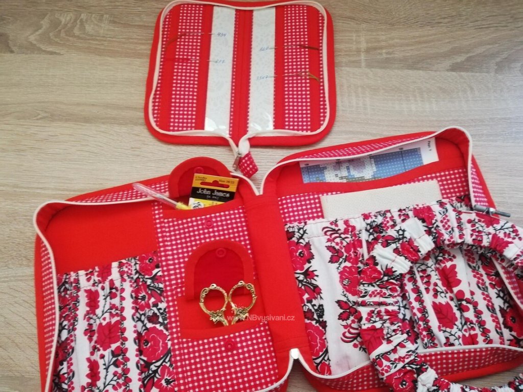 Praktický, ručně šitý cestovní set na zip s mnoha kapsičkami uvnitř pro úschovu vyšívacích pomůcek a přízí. Součástí je pouzdro pro ukládání návleků a jehel (22x11cm) a ochranný potah na vyšívací kruh o rozměru 16-20cm. Bez vybavení.