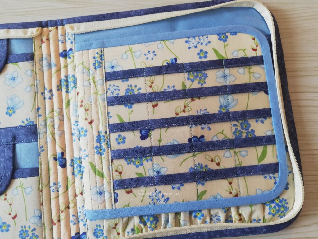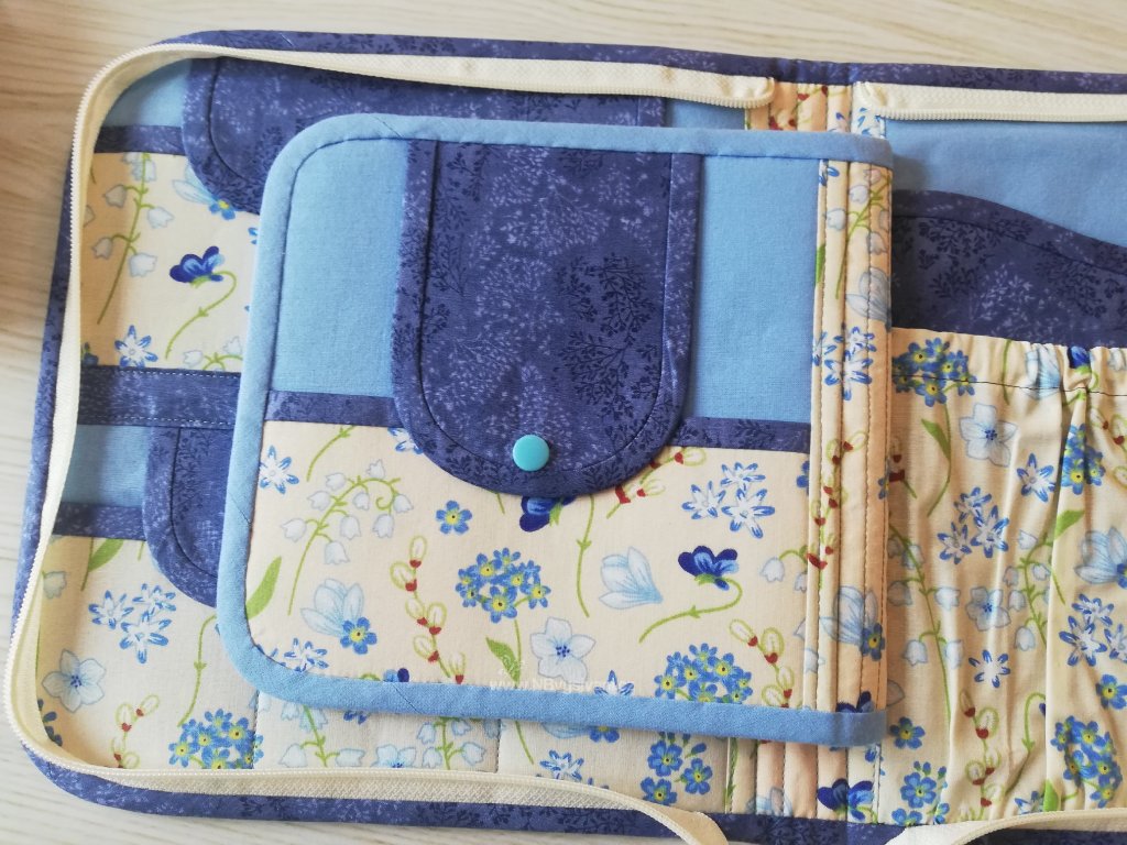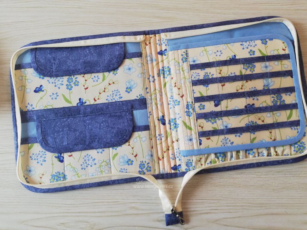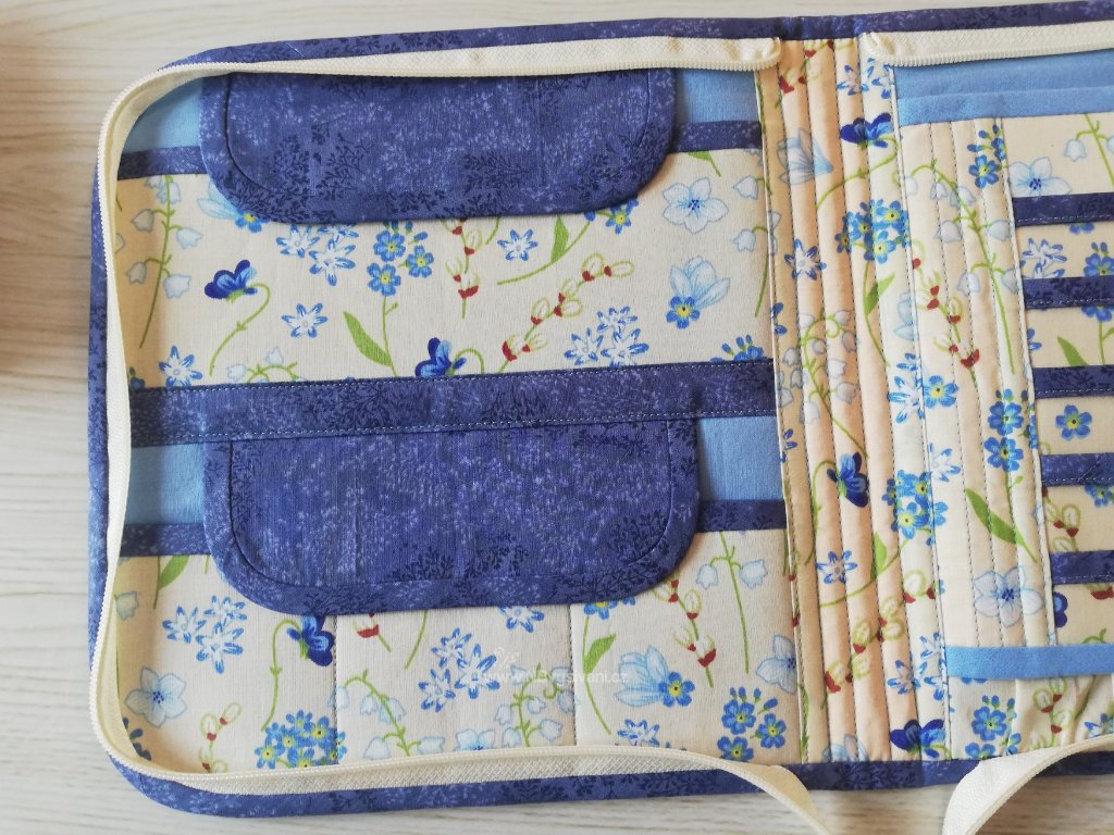 Praktický, ručně šitý cestovní organizér na zip s kapsičkami uvnitř pro úschovu vyšívacích pomůcek a přízí a rozdělaných projektů. Uvnitř je mnoho kapsiček pro uložení drobností a pomůcek. Do pouzdra se vejde i kruh do průměru 25cm.