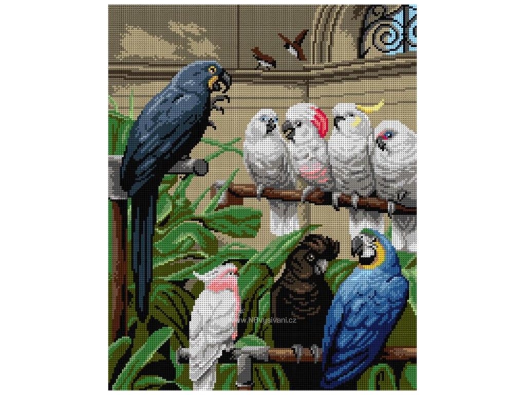 Barevně předtištěný motiv na látce bílý Stramín s barevným klíčem pro vyšívací příze.