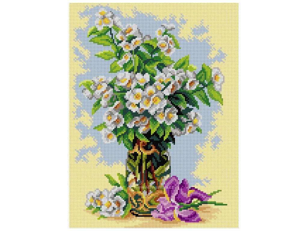 Barevně předtištěný motiv na látce bílý Stramín s barevným klíčem pro vyšívací příze.