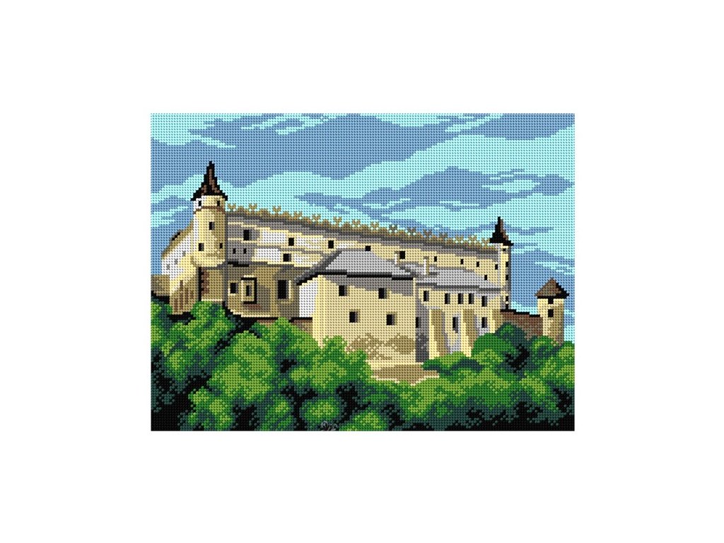 Barevně předtištěný motiv na látce bílý Stramín s barevným klíčem pro vyšívací příze.