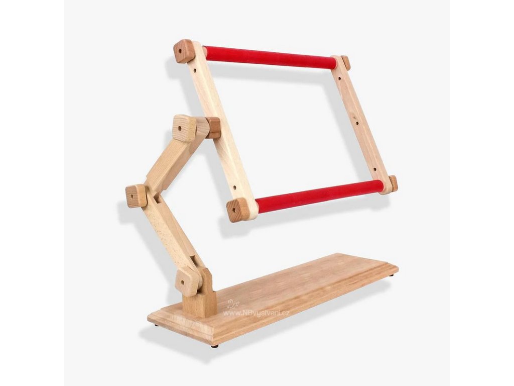 Univerzální stojánek s vyšívacím rámem vyrobený z dubového a lipového dřeva. Rám je vhodný pro gobelíny, na korálkování nebo křížkové vyšívání. Látka se zachycuje pomocí plastových klipů na dolní a horní tyčku. Stojan je kompaktibilní s vyšívacími rámy firmy Luca-s. Vhodný pro přisednutí na židli či křeslo.
