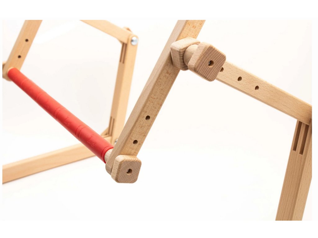 Univerzální stojan s vyšívacím rámem vyrobený z dubového a lipového dřeva. Rám je vhodný pro gobelíny, na korálkování nebo křížkové vyšívání. Látka se zachycuje pomocí plastových klipů na dolní a horní tyčku. Stojan je kompaktibilní s vyšívacími rámy firmy Luca-s. Vhodný pro přisednutí na židli či křeslo.