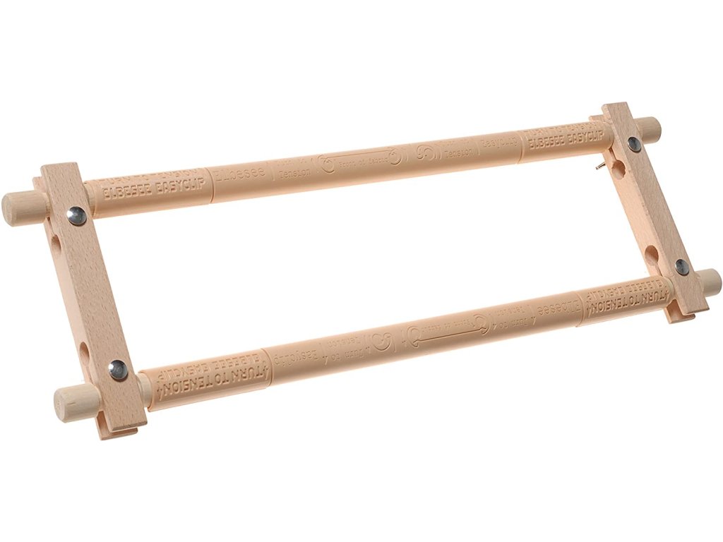 Jednoduchý a pevný vyšívací rám vyrobený z bukového dřeva. Rám je vhodný pro gobelíny, na korálkování nebo křížkové vyšívání. Látka se zachycuje pomocí plastových klipů na dolní a horní tyčku.
