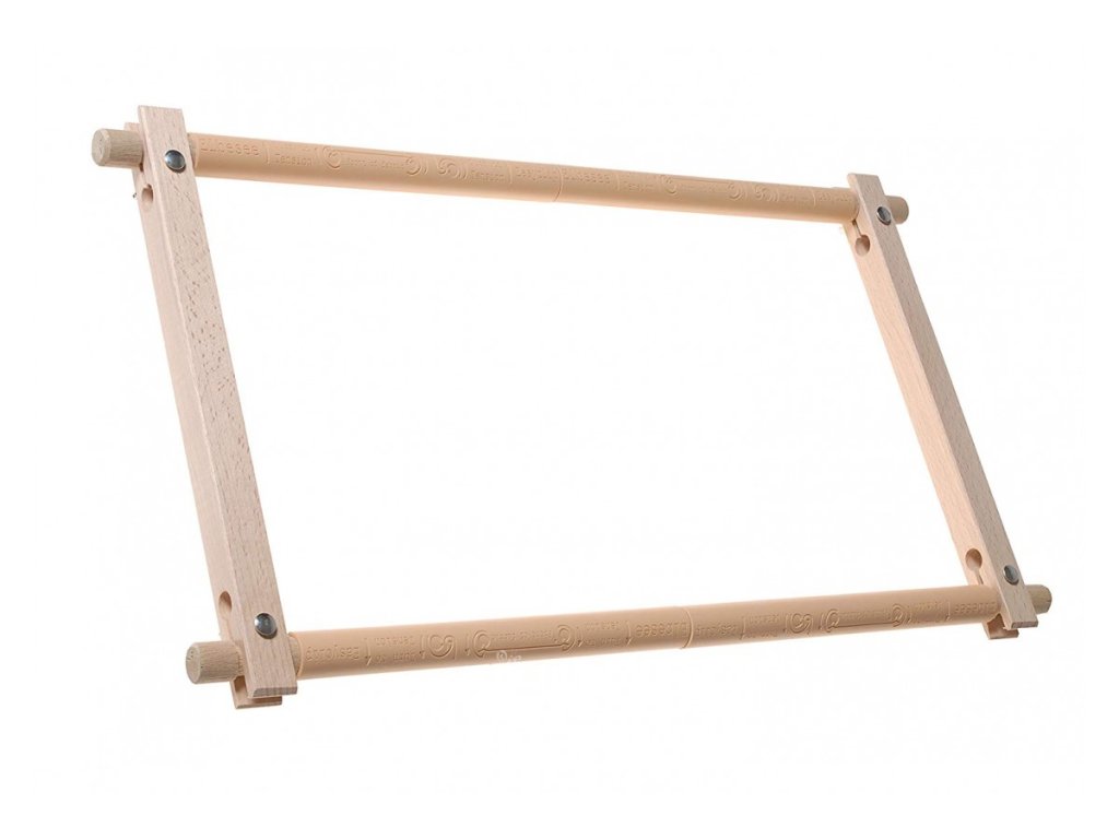 Jednoduchý a pevný vyšívací rám vyrobený z bukového dřeva. Rám je vhodný pro gobelíny, na korálkování nebo křížkové vyšívání. Látka se zachycuje pomocí plastových klipů na dolní a horní tyčku.