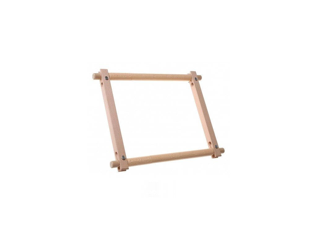 Jednoduchý a pevný vyšívací rám vyrobený z bukového dřeva. Rám je vhodný pro gobelíny, na korálkování nebo křížkové vyšívání. Látka se zachycuje pomocí plastových klipů na dolní a horní tyčku.