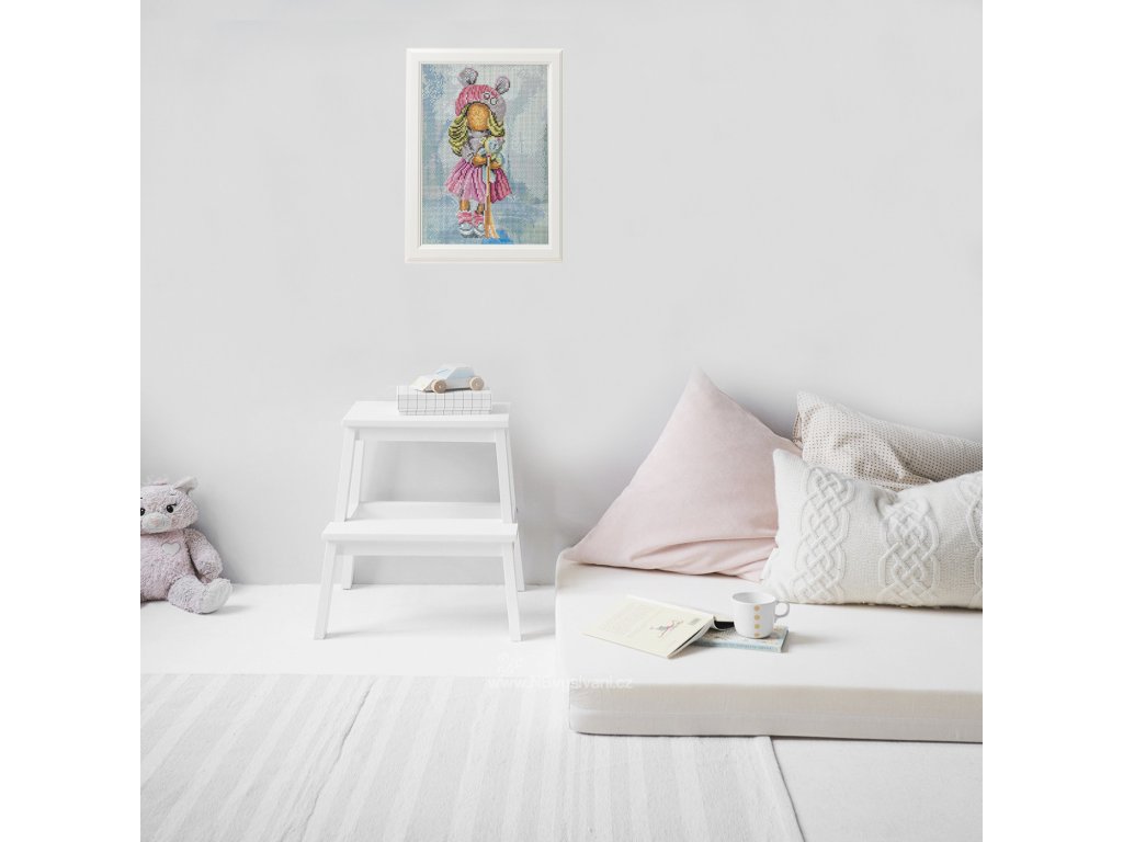 plátno s předtištěným motivem pokryté lepící vrstvou nataženou na dřevěném rámu včetně háčku k jeho finálnímu zavěšení na zeď