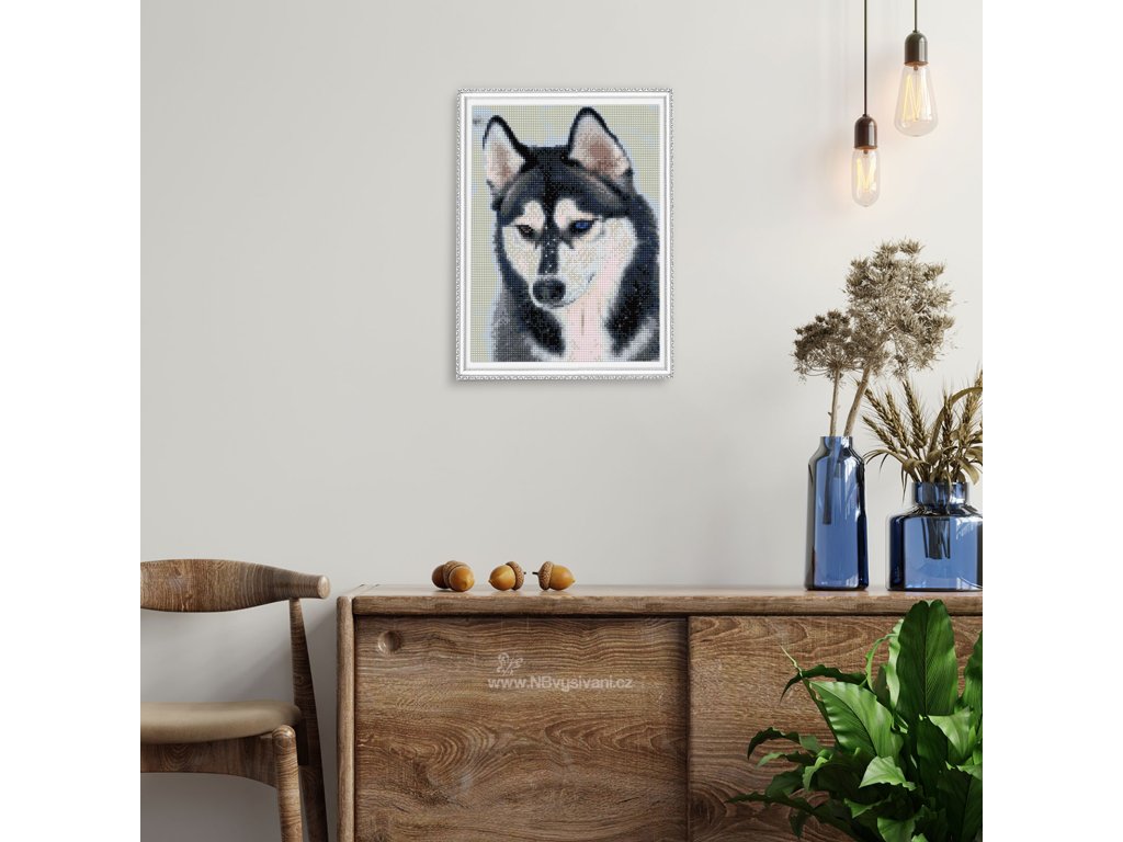 plátno s předtištěným motivem pokryté lepící vrstvou nataženou na dřevěném rámu včetně háčku k jeho finálnímu zavěšení na zeď