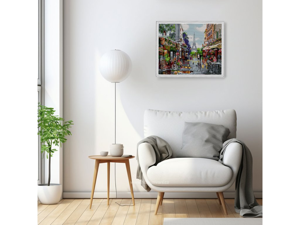 plátno s předtištěným motivem pokryté lepící vrstvou nataženou na dřevěném rámu včetně háčku k jeho finálnímu zavěšení na zeď