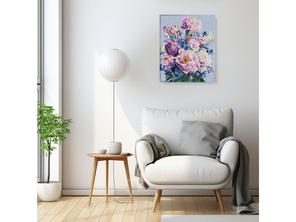 plátno s předtištěným motivem pokryté lepící vrstvou nataženou na dřevěném rámu včetně háčku k jeho finálnímu zavěšení na zeď