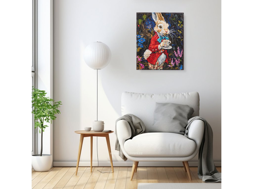 plátno s předtištěným motivem pokryté lepící vrstvou nataženou na dřevěném rámu včetně háčku k jeho finálnímu zavěšení na zeď