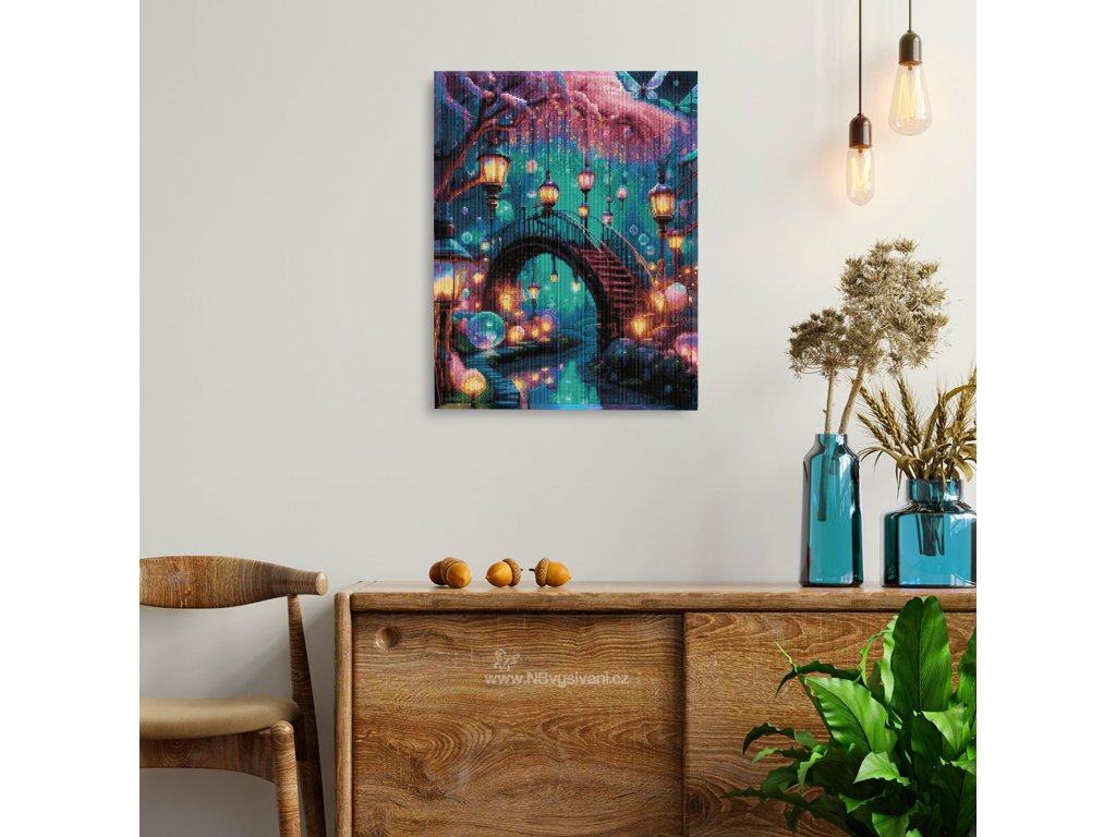 plátno s předtištěným motivem pokryté lepící vrstvou nataženou na dřevěném rámu včetně háčku k jeho finálnímu zavěšení na zeď