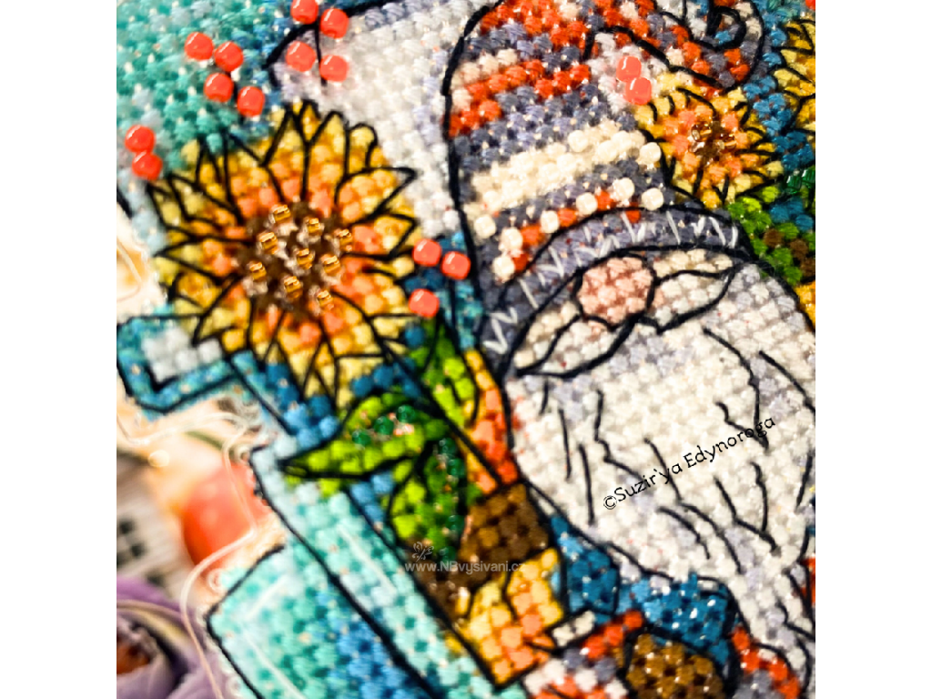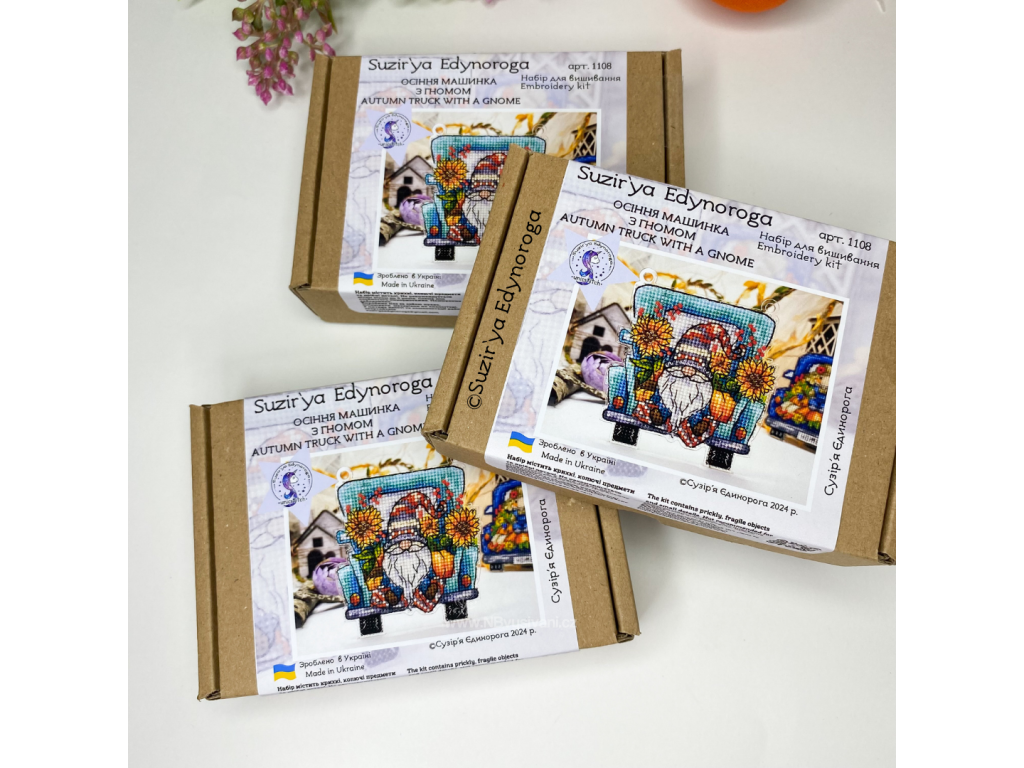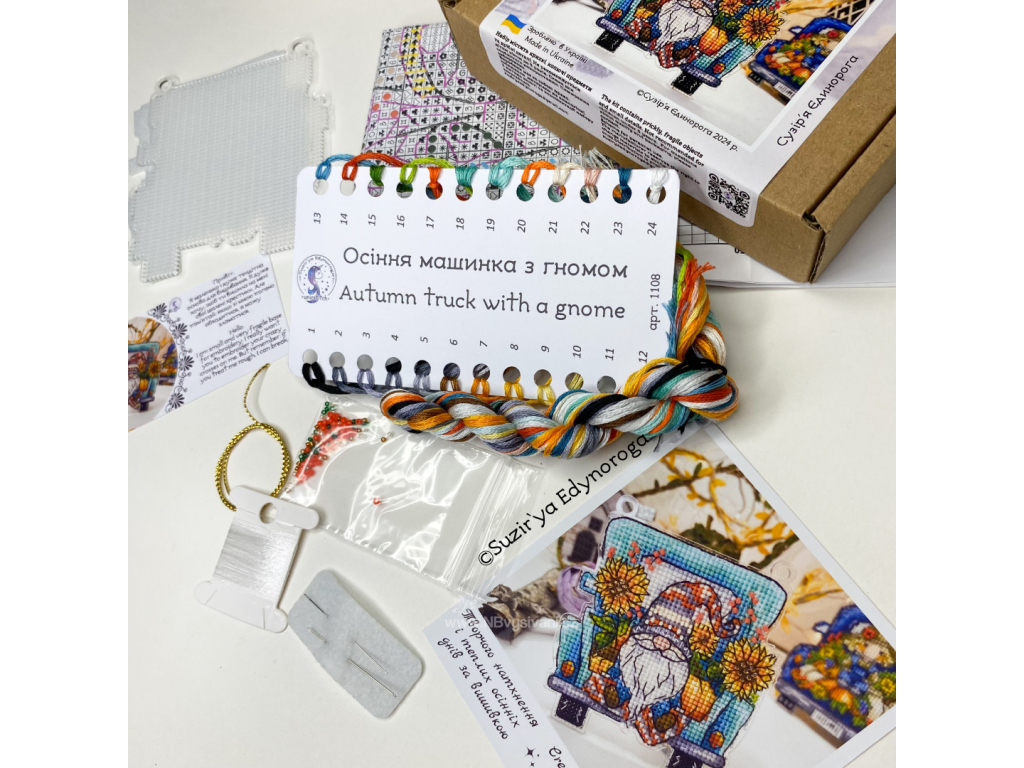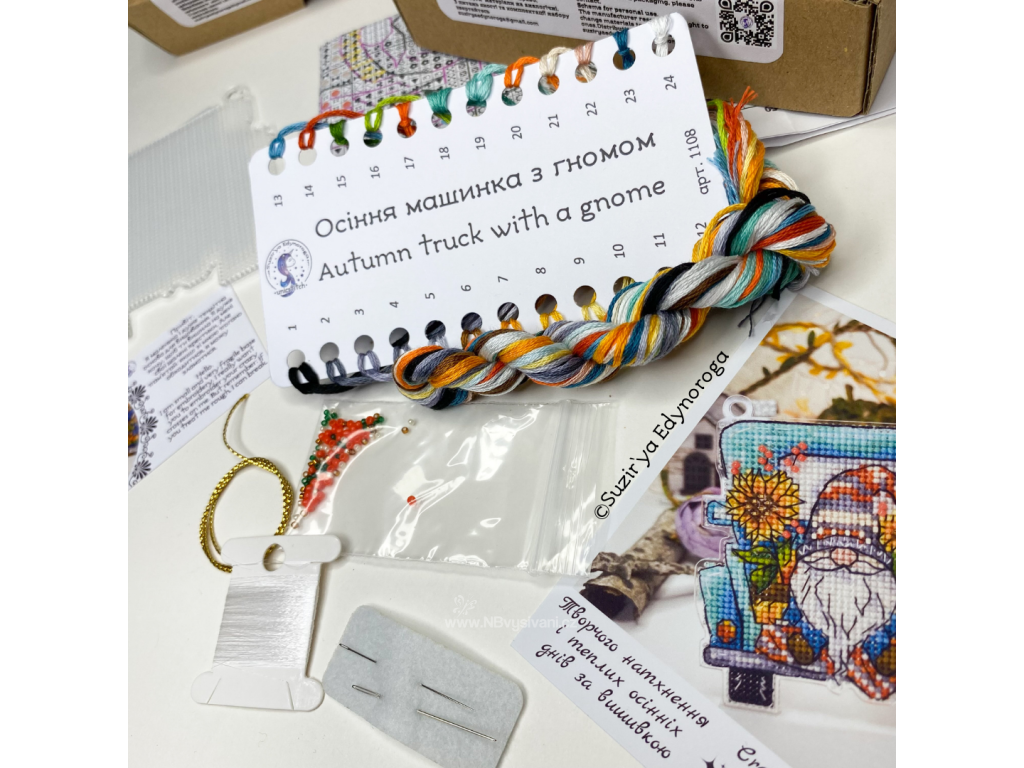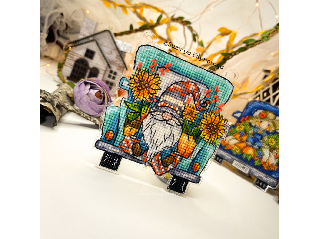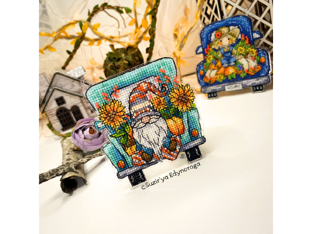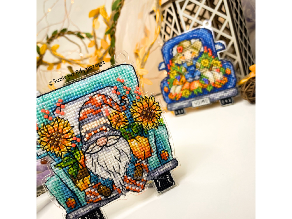 UNI-1108 Skřítek a auto s podzimním nákladem (vyšívaný plastový podklad)