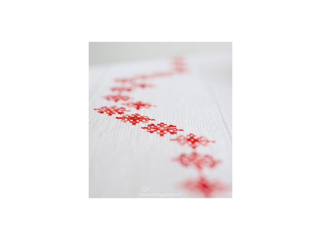 zaobroubený ubrus v barvě bílé (materiál 100% bavlna) s vetkaným pruhem Aidy pro vyšití motivu