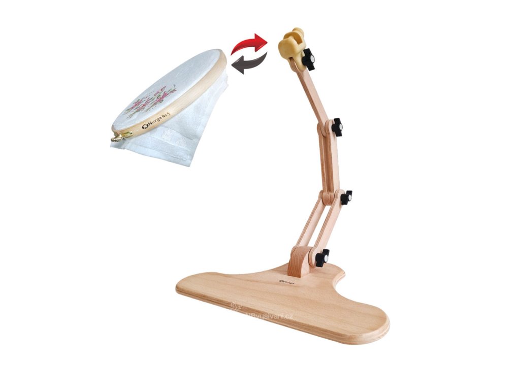 Nastavitelný stojan na vyšívání. Maximální výška stojanu je 50cm. Noha má 3 pohyblivé spoje, díky kterým je velice pohyblivá a umožňuje pohodlné nastavení. Stojan lze postavit na stůl, či jej přisednout. Obě ruce Vám zůstanou volné pro práci. Po skončení práce, lze sklopit a tím zabere málo místa. Rám či kruh není součástí balení. Vyrobeno z velmi kvalitního bukového dřeva.